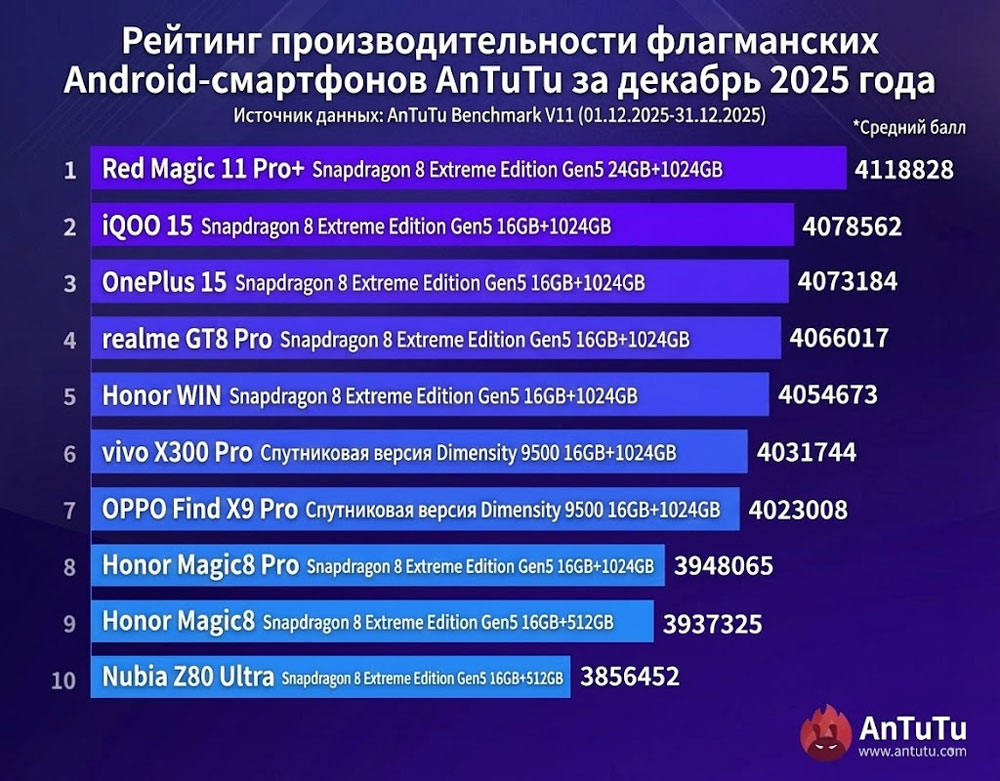 Начало 2026 года ознаменовалось обновлением рейтинга AnTuTu — главного бенчмарка для оценки производительности Android-устройств. Лидером третий месяц подряд остаётся игровой флагман Nubia Red Magic 11 Pro+ с рекордными 4,1 млн баллов. В топ-10 доминируют смартфоны на новейшем процессоре Snapdragon 8 Elite Gen 5, но есть и интересные исключения с чипами MediaTek.